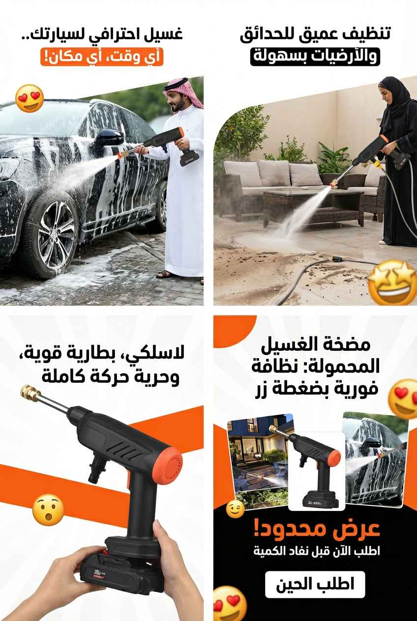 ودك تغسل منزلك و سيارتك بكل سهولة؟ 🚗 احصل على أقوى مضخة غسيل لاسلكية (400 واط) تنظف كل شيء! 💦 دفع عند الاستلام وضمان ذهبي لمدة عام. اطلب الآن